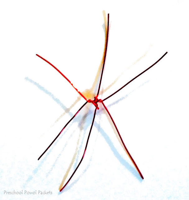 1- Cut the wire into three 4-inch long lengths for each snowflake. Twist them together in the middle to form the snowflake "skeleton." I did this in advance one night while my husband and I watched a show. It was super easy, and only took a few minutes for each snowflake. Alternatively, you could do it with your children or, if they're older, let them do it themselves.